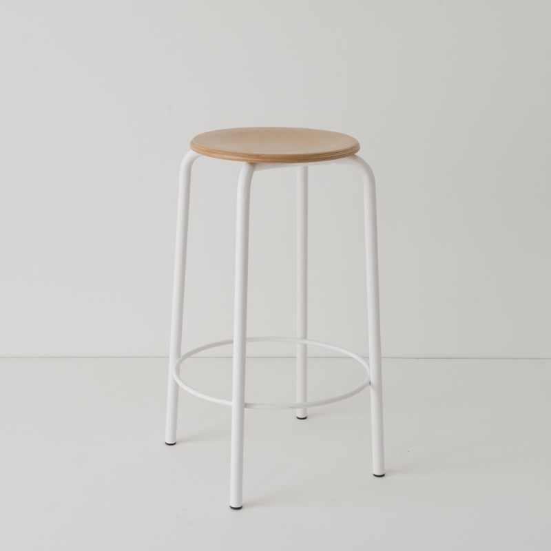 Haut 65 cm, larg 40 cm, prof 40 cm, hauteur assise 65 cm. poids 3.6 kg. Diamètre de l'assise 32 cm épaisseur 15 mm. Structure tube d'acier diamètre 22 mm thermolaqué époxy, assise en multiplis de hêtre naturel vernis. Non empilable, livré monté. Fabriqué en Belgique.