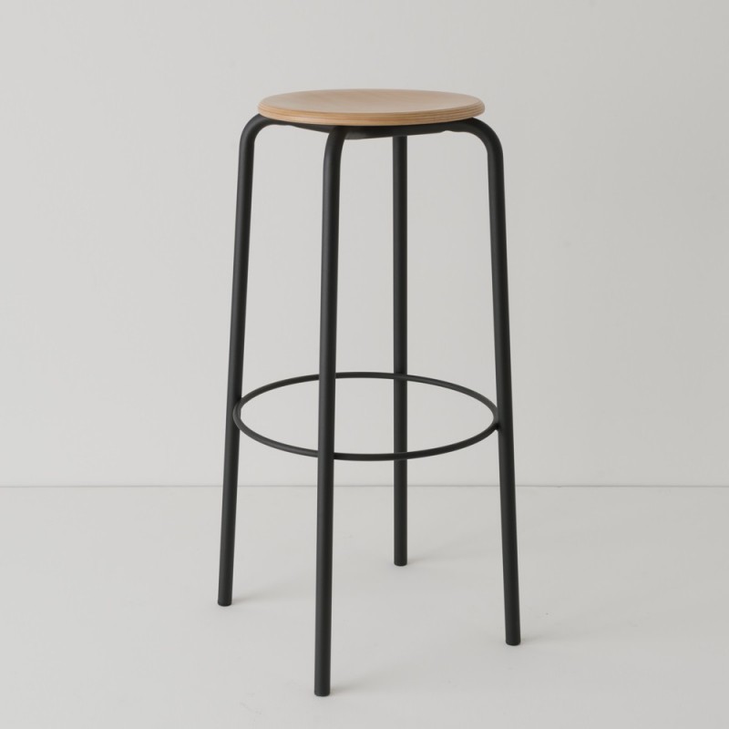 Ce tabouret haut de cuisine de 80 cm est prévu pour des tables de 105 à 110 cm de haut, soit à peu près la hauteur d'un bar. L'effet vintage et industriel est renforcé par l'emploi de multiplis de hêtre moulé vernis naturel. Disponible en plusieurs coloris de structure en métal, il existe aussi avec un revêtement stratifié ton/ton sur l'assise (les plis du contreplaqué restent visibles sur les côtés)