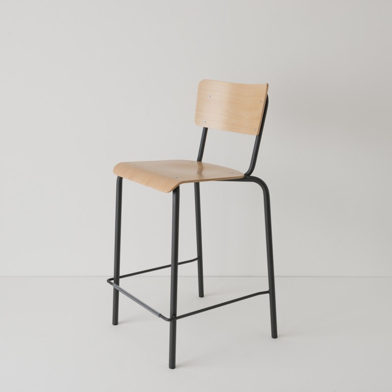 La hauteur d'assise de 65cm de cette chaise munie d'un repose pied est prévue pour des tables de hauteur 90 ou 95 cm de haut, soit la plupart des tables de cuisine dites "américaines". Elle a exactement le même confort qu'une chaise normale, avec une belle profondeur d'assise et un véritable dossier. L'effet vintage et industriel est renforcé par l'emploi de multiplis de hêtre moulé vernis naturel. Disponible en plusieurs coloris de structure en métal, la chaise existe aussi avec un revêtement stratifié ton/ton sur l'assise et le dossier.