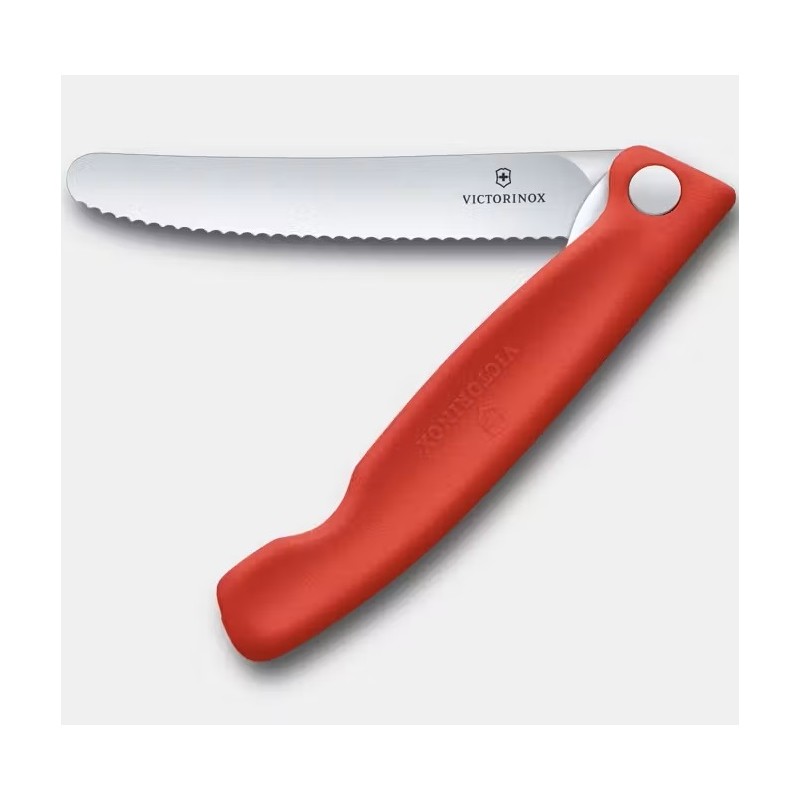 Ici, le couteau d'office pliant rouge denté. Facile à repérer dans un tiroir grâce à son manche rouge "Suisse", il saura aussi se glisser dans un sac pour un pique-nique, une lunch-box ou un sac de randonnée. Le manche ergonomique permet une très bonne tenue en main.