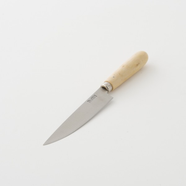 Ultra-simplicité du manche tout en rondeur, rusticité de lames destinées aux travaux d'office, mais douceur et blondeur du buis tourné, ce bois au grain si fin qu'il est considéré par les sculpteurs comme de "l'ivoire végétal". Notre coutelier Catalan l'a aussi choisi pour ses manches de couteaux d'office parce que le buis est tout simplement le bois local. Ce genre de couteau traditionnel est considéré en Espagne comme LA référence, l'Opinel Ibérique en quelque sorte. Des multiples variantes de forme et de taille proposées pour les couteaux d'office, la version en lame de 12 cm est ici déclinée en lame inox pour la table.