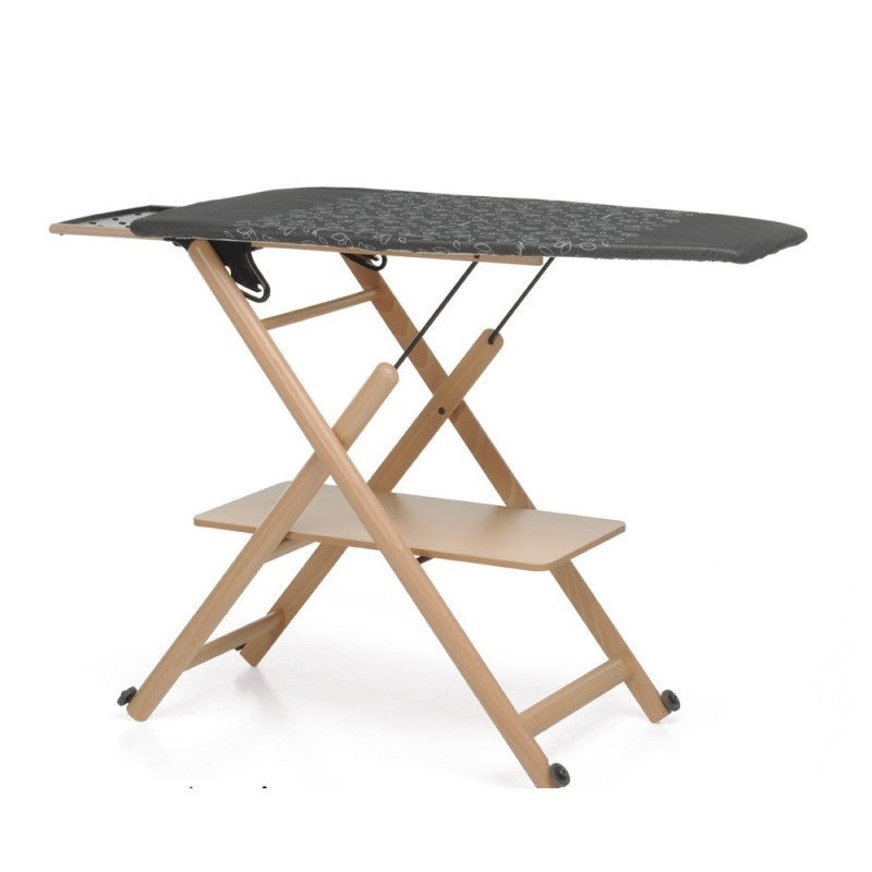 Outre le charme du hêtre naturel vernis dont elle est fabriquée, cette planche à repasser propose trois hauteur de travail, dont la plus basse est éventuellement à hauteur de chaise ou de tabouret mi haut. Elle est équipée d'un plateau repose-linge et d'un porte-fer coulissant amovible en métal noir. La planche elle même est en aggloméré de peuplier (léger) percé de trous pour favoriser la ventilation. Elle est habillé d'un premier molleton en polyester, puis d'une housse en coton floqué aluminium pour la protéger des brûlures éventuelles. Molleton et housse de rechange sont disponibles sur demande. Ses quatre petites roulettes qui ne touchent le sol qu'en position pliée, permettent de ranger la planche à repasser sans effort. Poids total 8.7 kg.