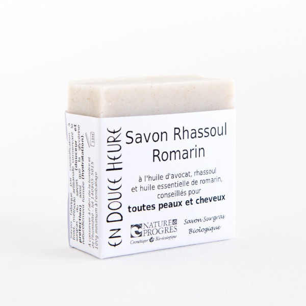 Ici un savon "rhassoul romarin". En fixant naturellement les excès de sebum et l'eau, le rhassoul, une argile ultra-fine et très douce, est un excellent soin du visage et un shampooing naturel, même pour cheveux longs, qui agit sans tensio-actifs. Associé ici à de l'huile d'avocat nourrissante, et au parfum de romarin fortifiant, voilà de quoi tirer définitivement un trait sur les savons liquides, les additifs de synthèse et les flacons vides qui vont avec.