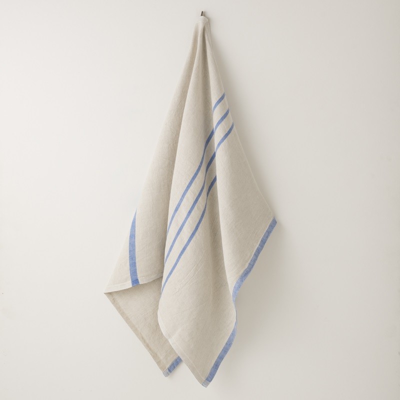 En direct de Finlande, par la, marque Lapuan Kankurit, qui nous apporte le fin du fin de sa culture "bain-sauna", voici une serviette de bain en lin lavé en taille 70x130. Coloris lin naturel surligné de rayures bleu vif.